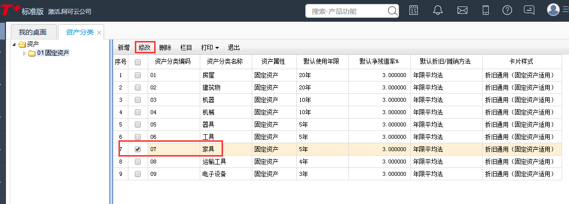 用友T+12.1如何修改折旧年限?