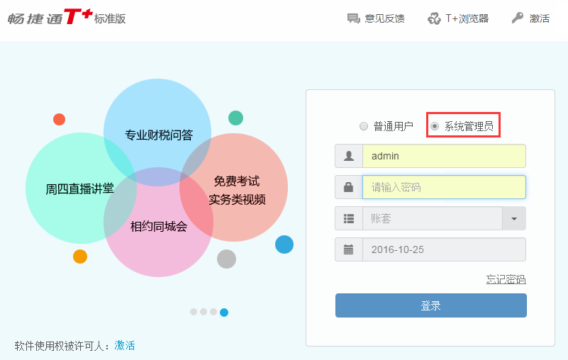 登录用友T+软件,选择用户的时候要选择“系统管理员“,并输入admin的密码,直接登录即可。