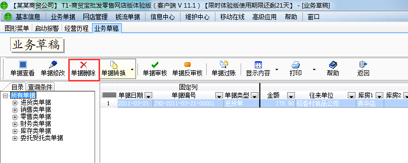 畅捷通t1商贸宝怎样删除业务草稿单据?