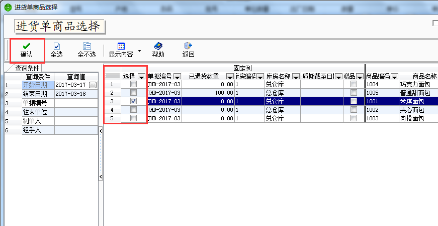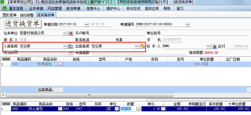 5、输入入库库房,换货的商品数量,确认无误之后点击单据过账,提示保存成功即可。