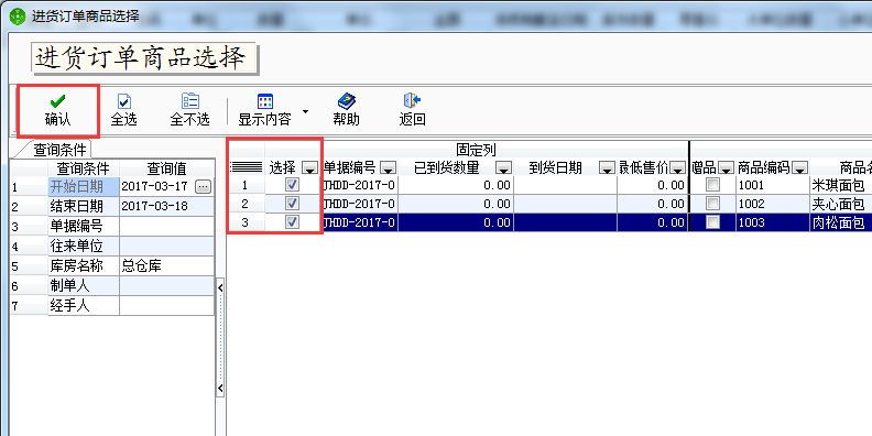 4、勾选入库的商品,点击确认。