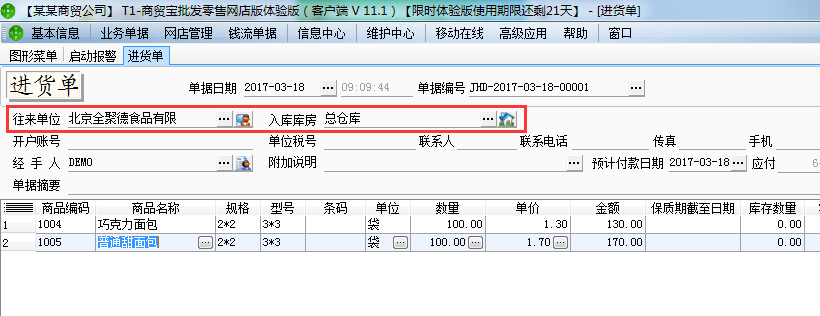 2、填写单据资料如往来单位名称,入库库房,商品名称,数量,单价等。