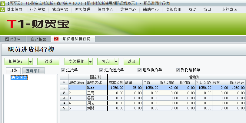 怎样查询用友t1财贸宝10.0的员工的进货情况?