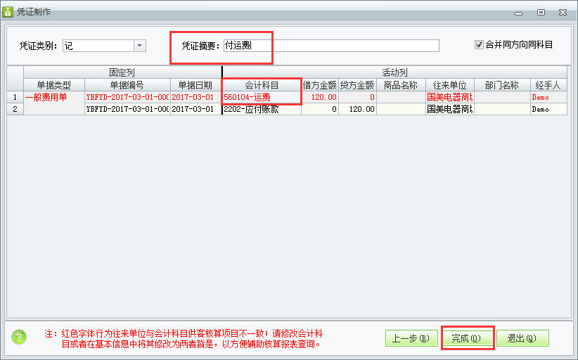4、选择对方科目,输入凭证摘要,点击完成即可。