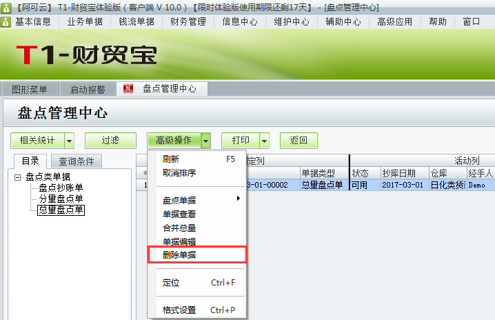 4、点中单据,点击高级操作中的删除单据,删除即可。