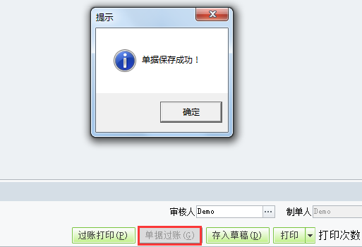 3、确认单据资料无误之后点击单据过账,提示单据保存成功即可。