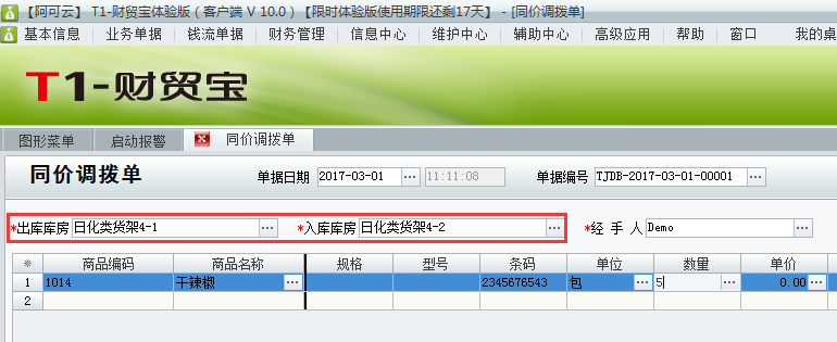 用友t1财贸宝10.0如何进行仓库调拨处理?