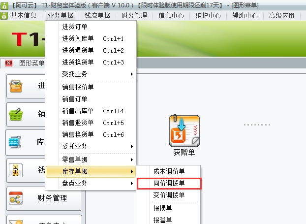 1、登录软件打开业务单据——库存单据——同价调拨单。