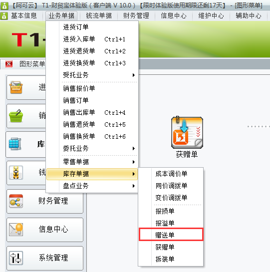 1、登录软件打开业务单据——库存单据——赠送单。