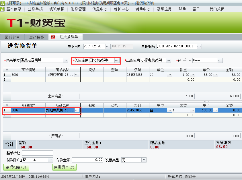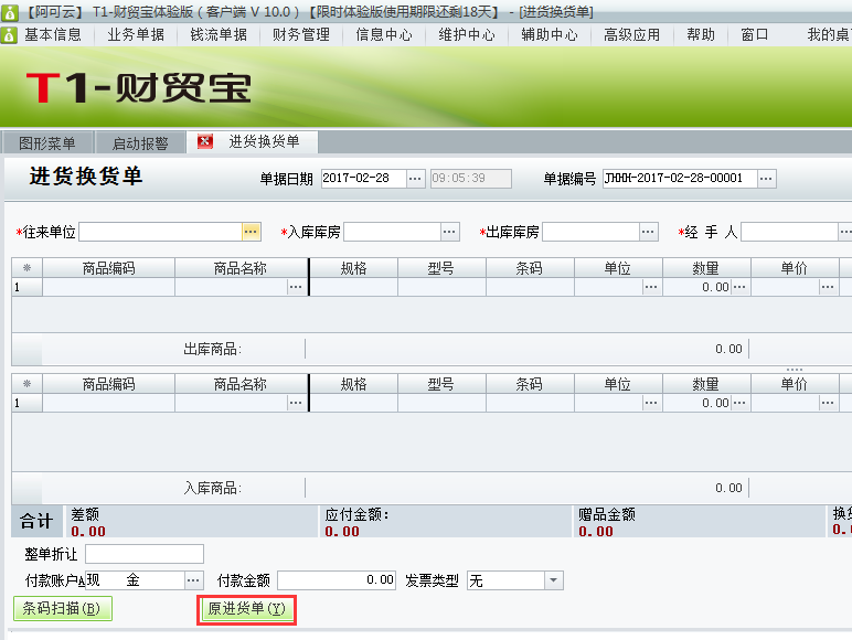 用友t1财贸宝10.0进货换货如何处理?