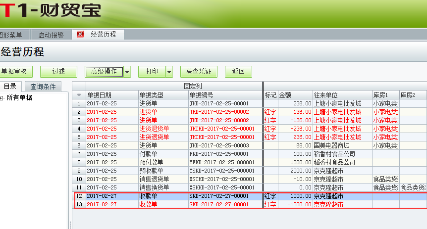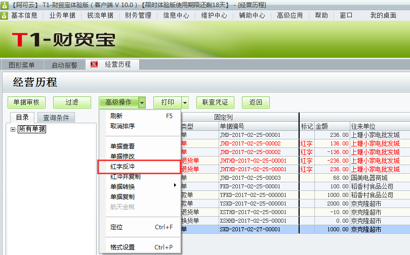 3、选中收款单点击高级操作里面的单据红冲即可。