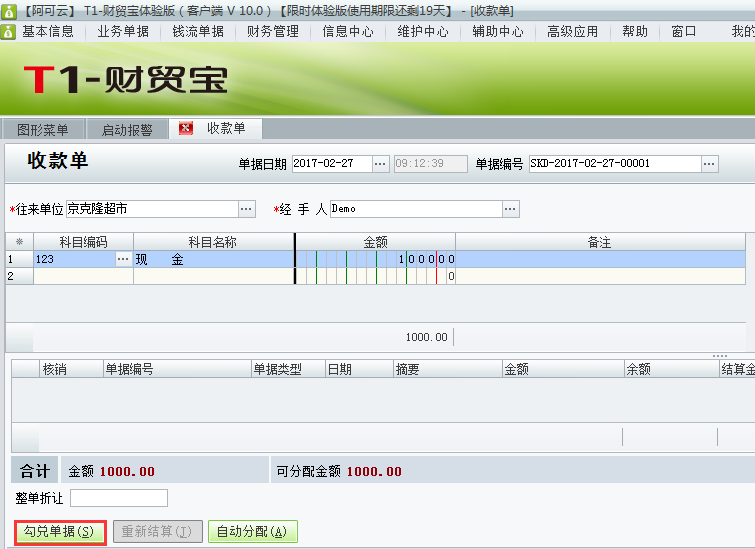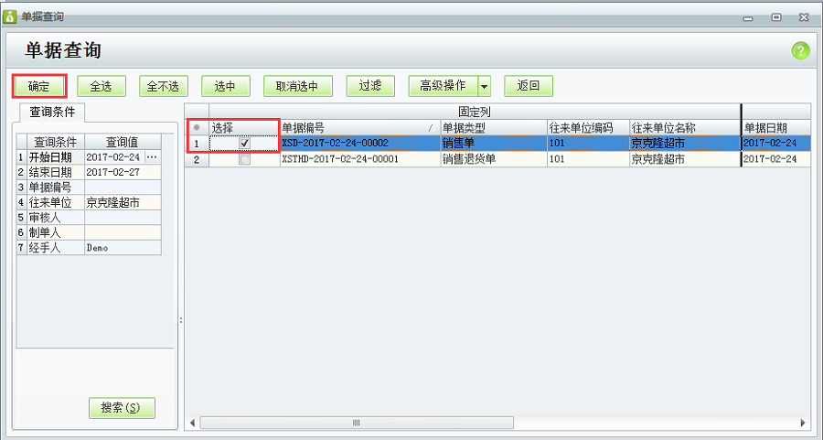 4、输入查询单据的条件,点击确认查询出需要勾兑的单据。