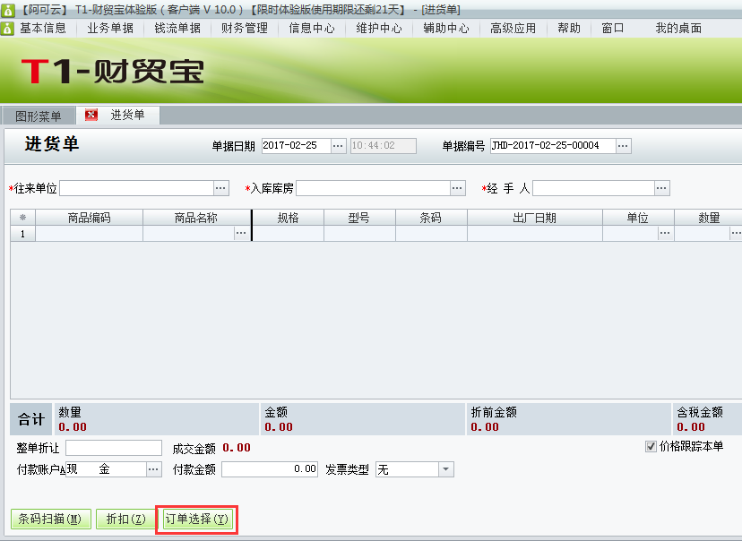 用友t1财贸宝10.0进货订单如何生成进货入库单?
