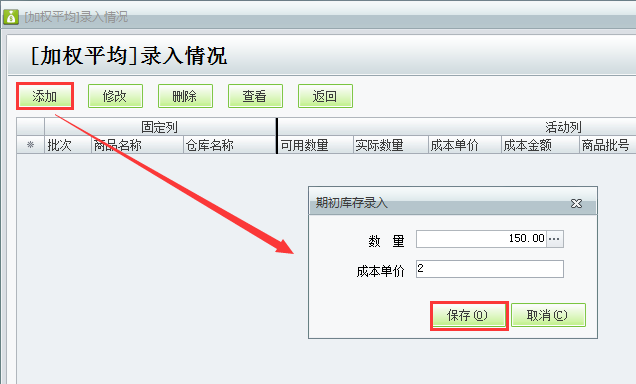 4、点击添加输入期初数量和成本金额,点击保存即可。