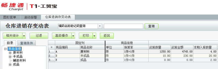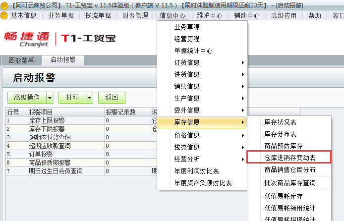 1、登录软件打开信息中心——库存信息——仓库进销存变动表。