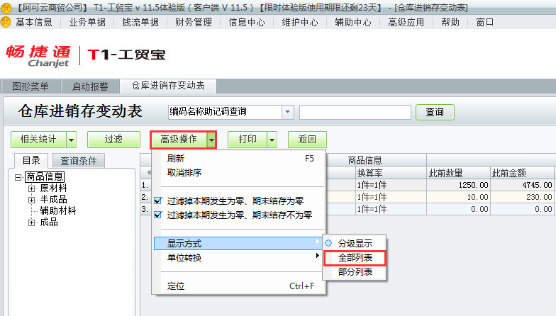 4、在高级操作中可以过滤数量为零的商品,设置显示样式。