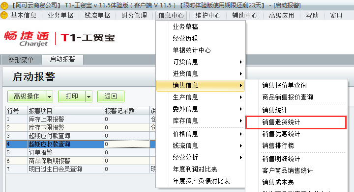 1、登录软件打开信息中心——销售信息——销售退货统计。