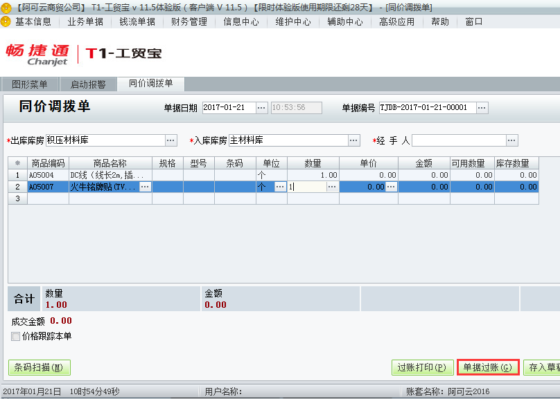 2、输入出入库仓库,以及调拨的商品资料,确认无误之后点击单据过账即可。