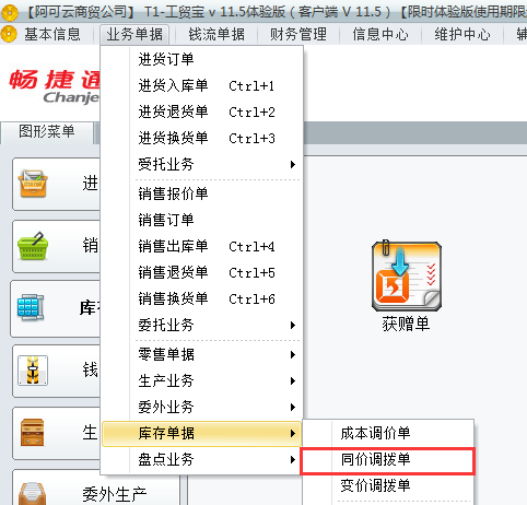 1、登录软件打开业务单据——库存单据——同价调拨单。