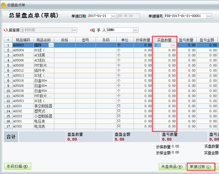 7、将实际盘库数量输入到实盘数量中,确认无误之后点击单据过账即可。