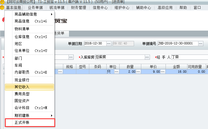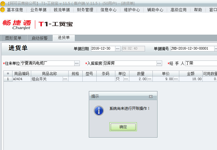 用友t1工贸宝11.5填写单据时提示“系统尚未进行开帐操作”是该如何处理?