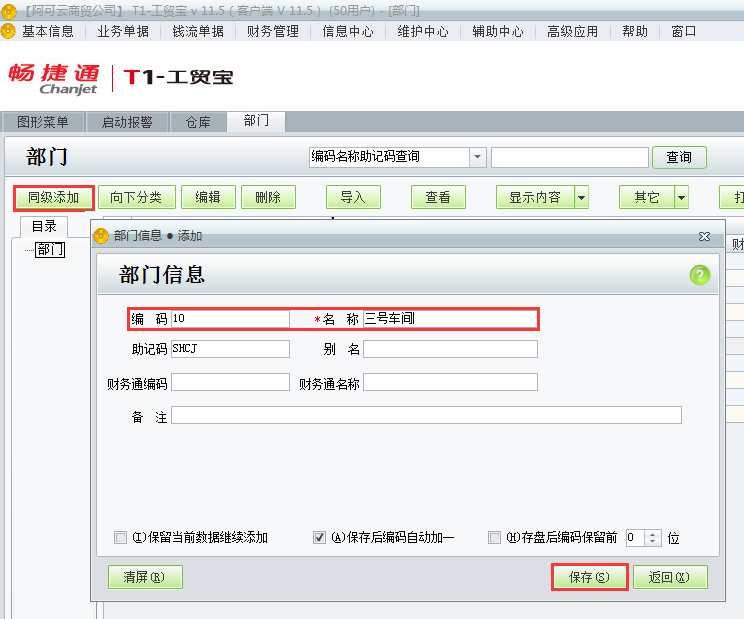 2、点击同级添加录入编号和名称,点击保存,提示保存成功即可。