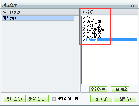 2、选择需要查询的门店,选择之后点击选中。