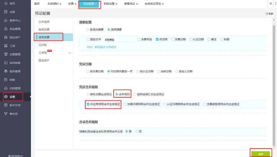 一、在【设置】-【凭证配置】-【进项发票】-【合并规则】-【供应商相同合并生成凭证】设置合并规则;