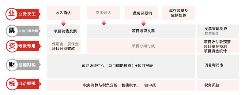 解决方案:业票财税的一体化、实时化、自动化。会计事务灵活配置,项目相关收入、成本、费用等业务单据自动生成凭证,并按项目辅助核算自动出具账务报告,项目利润表、项目辅助核算报表。一键取票、无需录入、发票项目登记;发票认证测算、税负管理;税负分析,税务风险检测,规避风险;税务自动化,自动税务报表,智能报税。