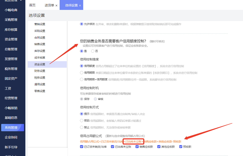 ①在【系统管理】-【选项设置】-【资金设置】开启【销售业务是否需要客户额度控制】。