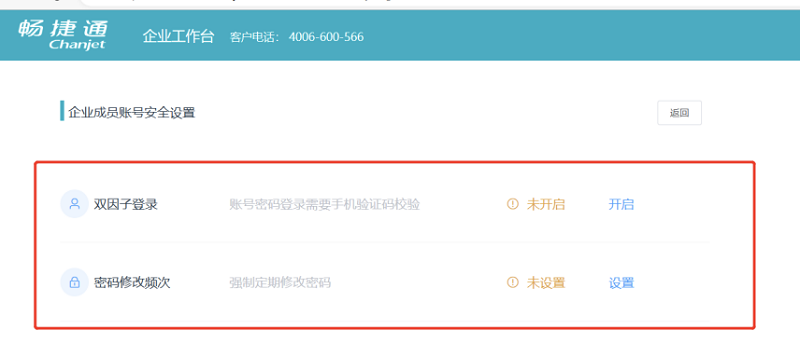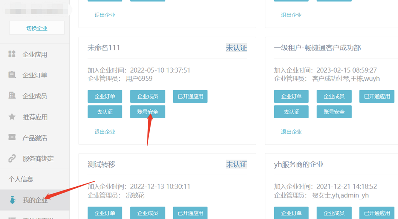 产品解决方案:浏览器登录畅捷通官网:www.chanjet.com点击右上角【姓名】下方的【企业工作台】,在【企业工作台】右侧,点击【我的企业】,在企业卡片上,点击【账号安全】