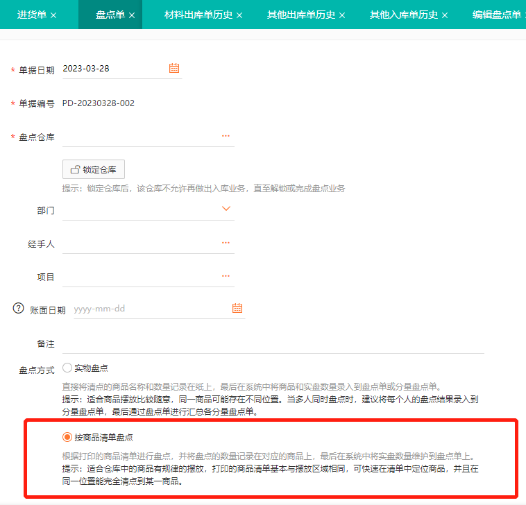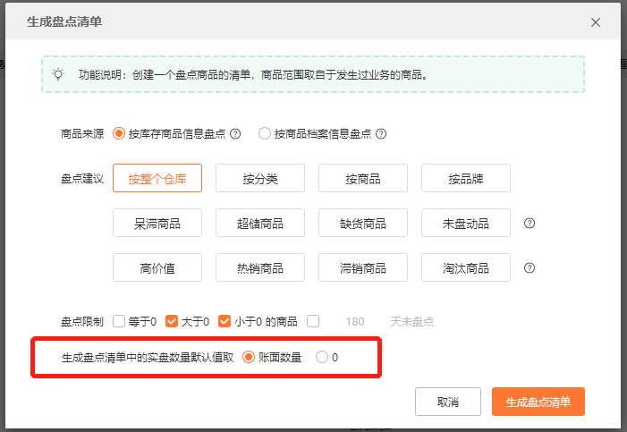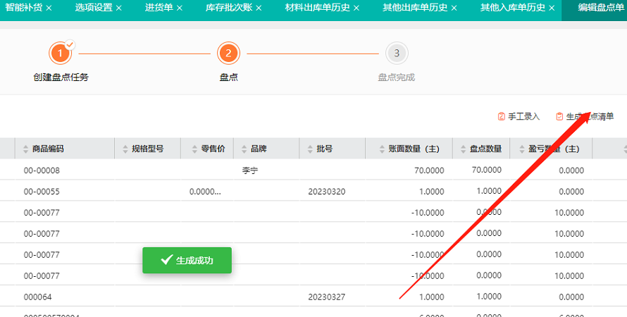 3、如果是已生成的盘点清单,需要编辑全部清空账面数量,则进入盘点单后,右上角重新选择“生成盘点清单”,切换选项为0重新生成即可。