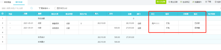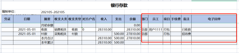 日记账下载的数据与列表显示一致,如列表显示增加部门、项目、备注等,下载的表格也含这些数据,如下图
