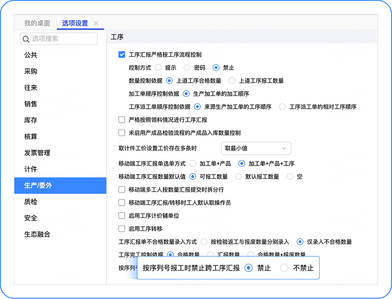 生产-工序下增加按序列号报工时禁止跨工序汇报选项,开启后可按序列号检查是否跨工序加工顺序汇报