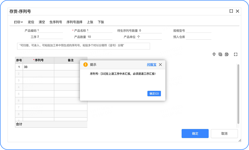 进行序列号单件管理的产品在加工过程中需严控工序加工顺序,禁止跨工序汇报,以避免产品质量等问题发生。如序列号为SN1的产品必须在工序1汇报后才能工序2进行汇报