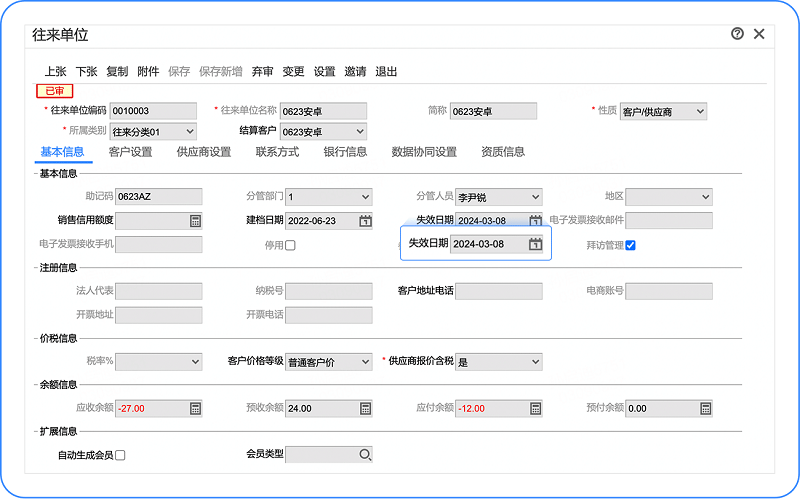 二、在【往来单位】档案中,设置【失效日期】