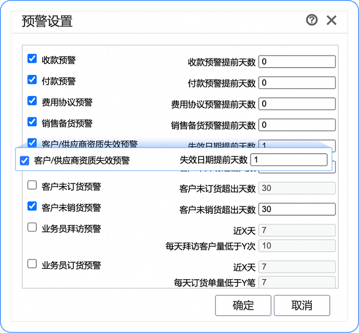 一、在【系统管理】-【预警设置】中。勾选【客户/供应商资质失效预警】,设置提前预警天数。