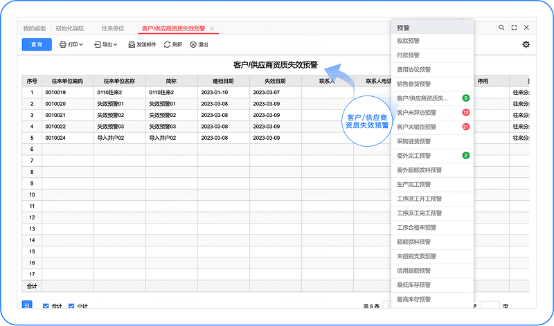 针对这一场景,产品增加了供应商/客户资质失效预警功能,到临近资质效期时,系统会给出预警。