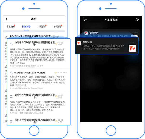 三、当客户/供应商符合设定的预警条件时,系统会发送预警消息,展示预警信息