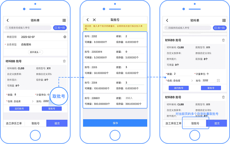 工人在按照批号进行领料时,可以根据存货的可用量和批号选取对应批号进行领料。