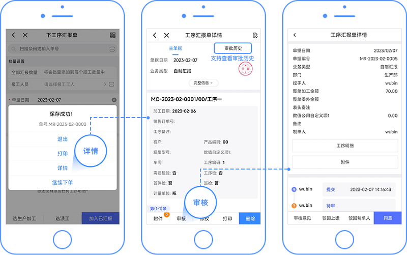 当工序汇报单启用审批流时,工人进行工序汇报后,需要方便快捷地查看该汇报单的审批进度。尤其是第一级审批人为本人的情况,支持在汇报完成后,快速进行第一级审批。