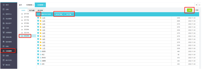 【归档管理】--选择年份【2022】--点击右上角【归档】--勾选需要下载账套--点击【Excel下载】或者【PDF下载】