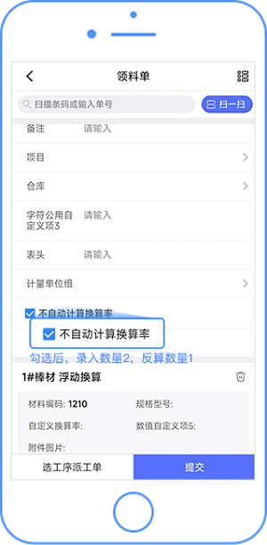 领料单表头增加”不自动计算换算率“选项,勾选后,单据中换算率保持不变,录入数量2后自动反算数量1,选项支持记忆,默认隐藏在单据表头中,点击“展开表头”后进行设置。