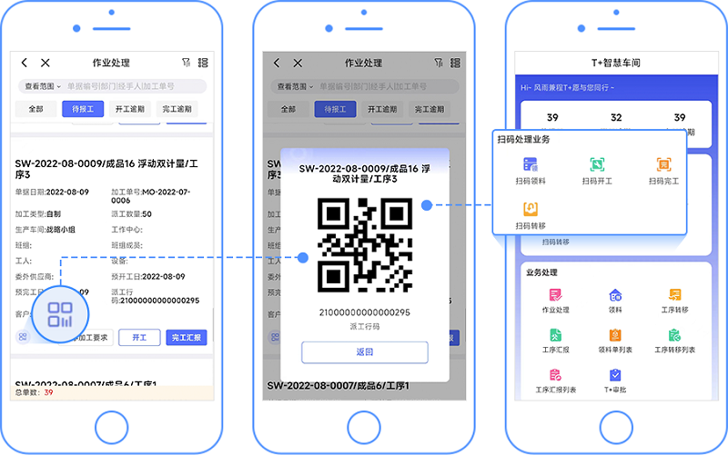 在作业处理和派工单详情页面增加二维码显示,点击后该派工单的派工行码以二维码形式进行展示,工人可以使用自己的任务进行领料或者转移交接。