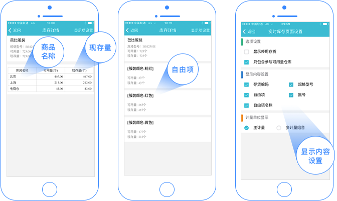 支持按存货的自由项、批号钻取查询各仓库的库存量。