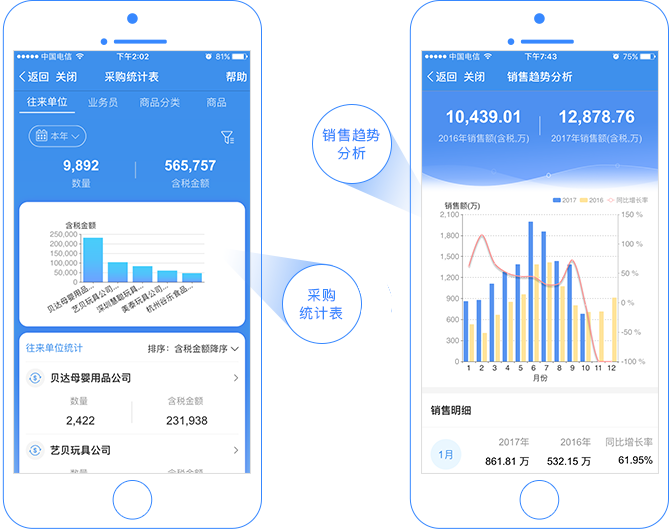 新增采购统计表,反映企业采购情况;新增销售趋势表,反映销售趋势变化