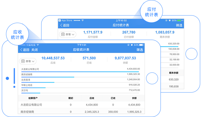 往来类报表: 应收统计表、应付统计表