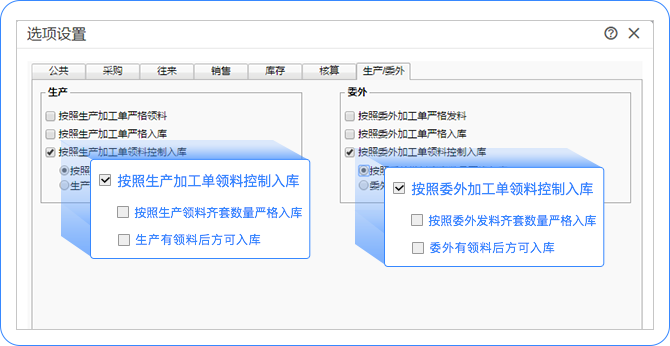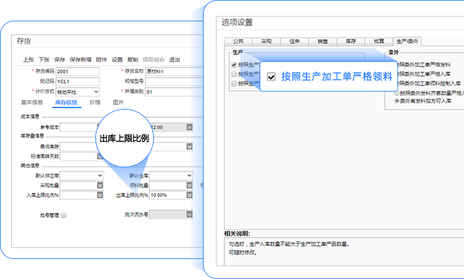 存货档案中,原材料1出库上限10%,选项控制按照生产加工单严格领料