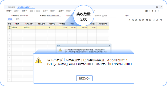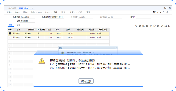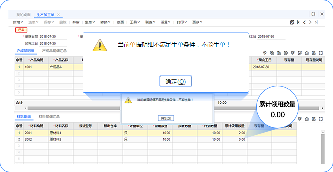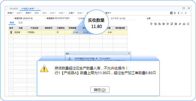 生产加工单原材料1数量10,出库时最大可入库数量为11,超过时控制