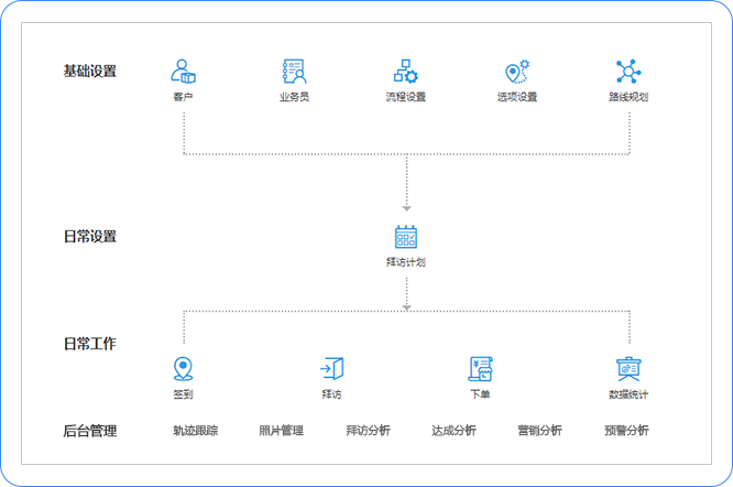 拜访业务流程:支持流程设置,移动端可根据后端设置的拜访流程跳转相应页面。